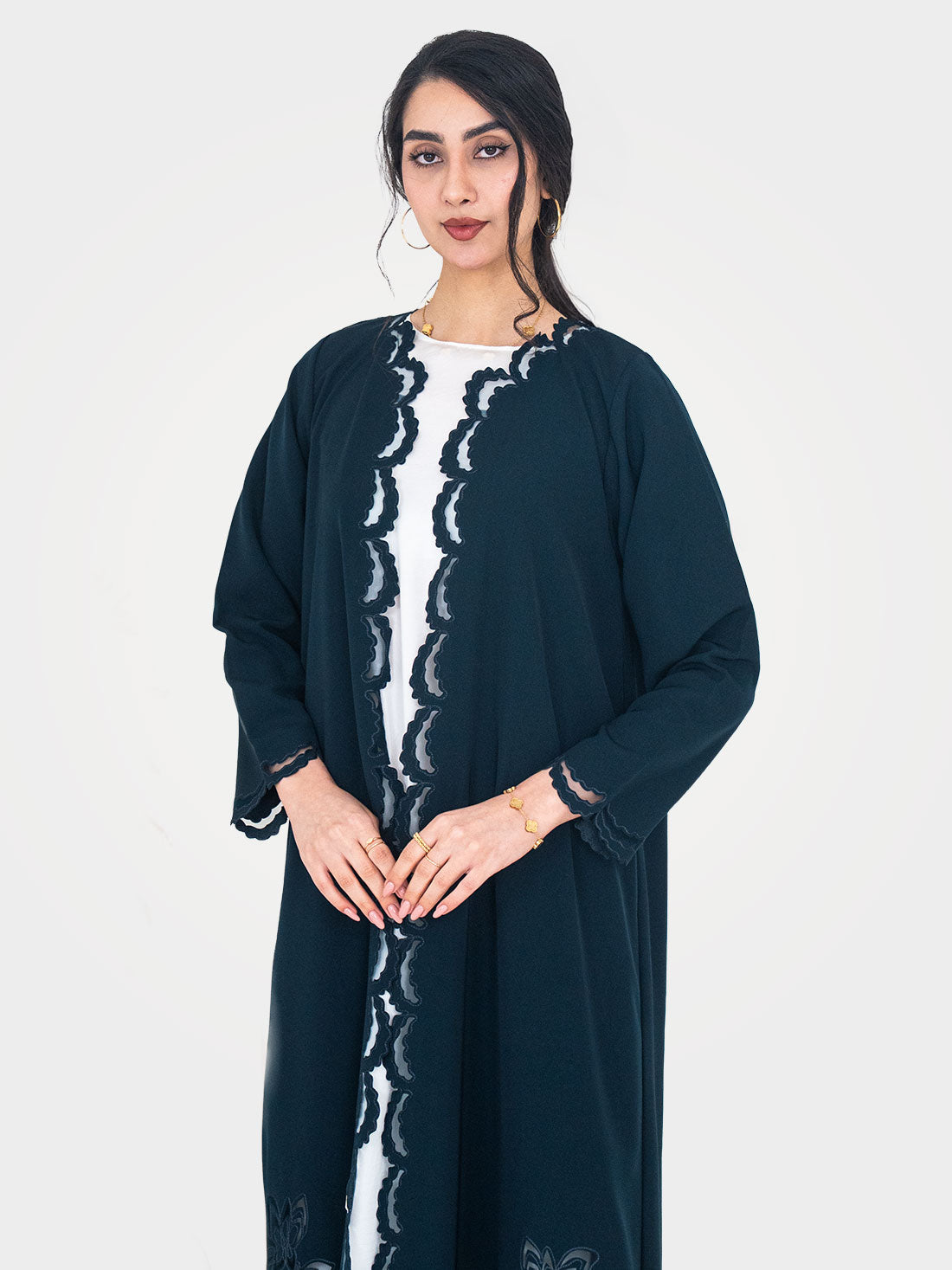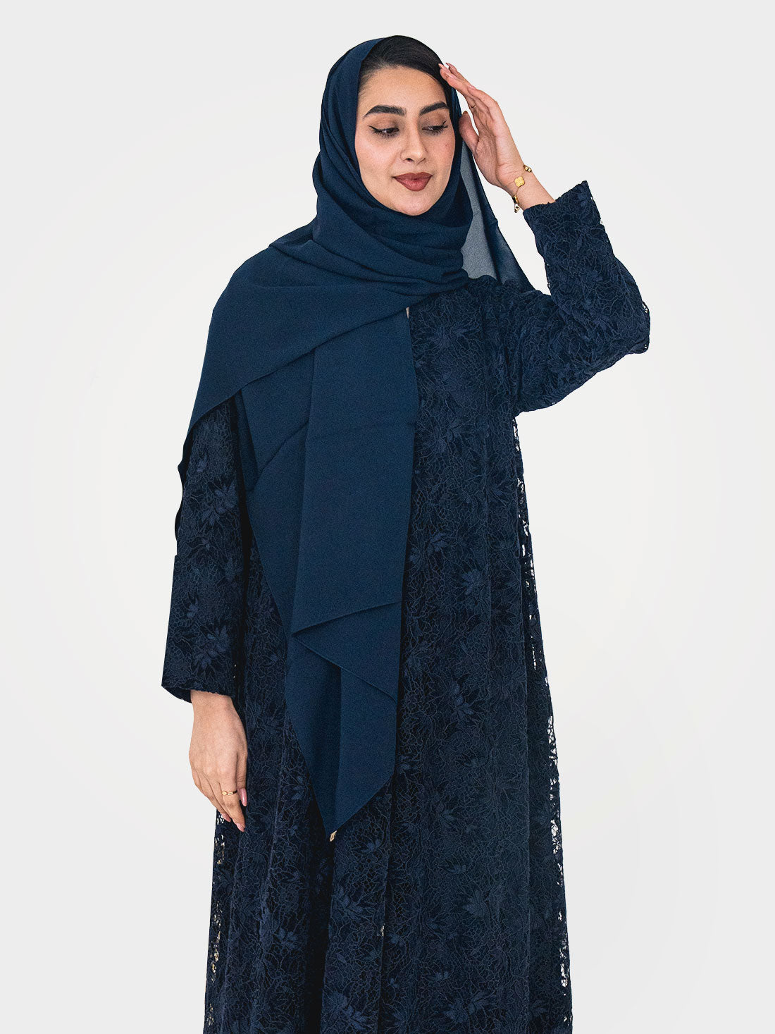 The Sapphire Lace Abaya by Layaal is a work of wearable artistry — a luxury...