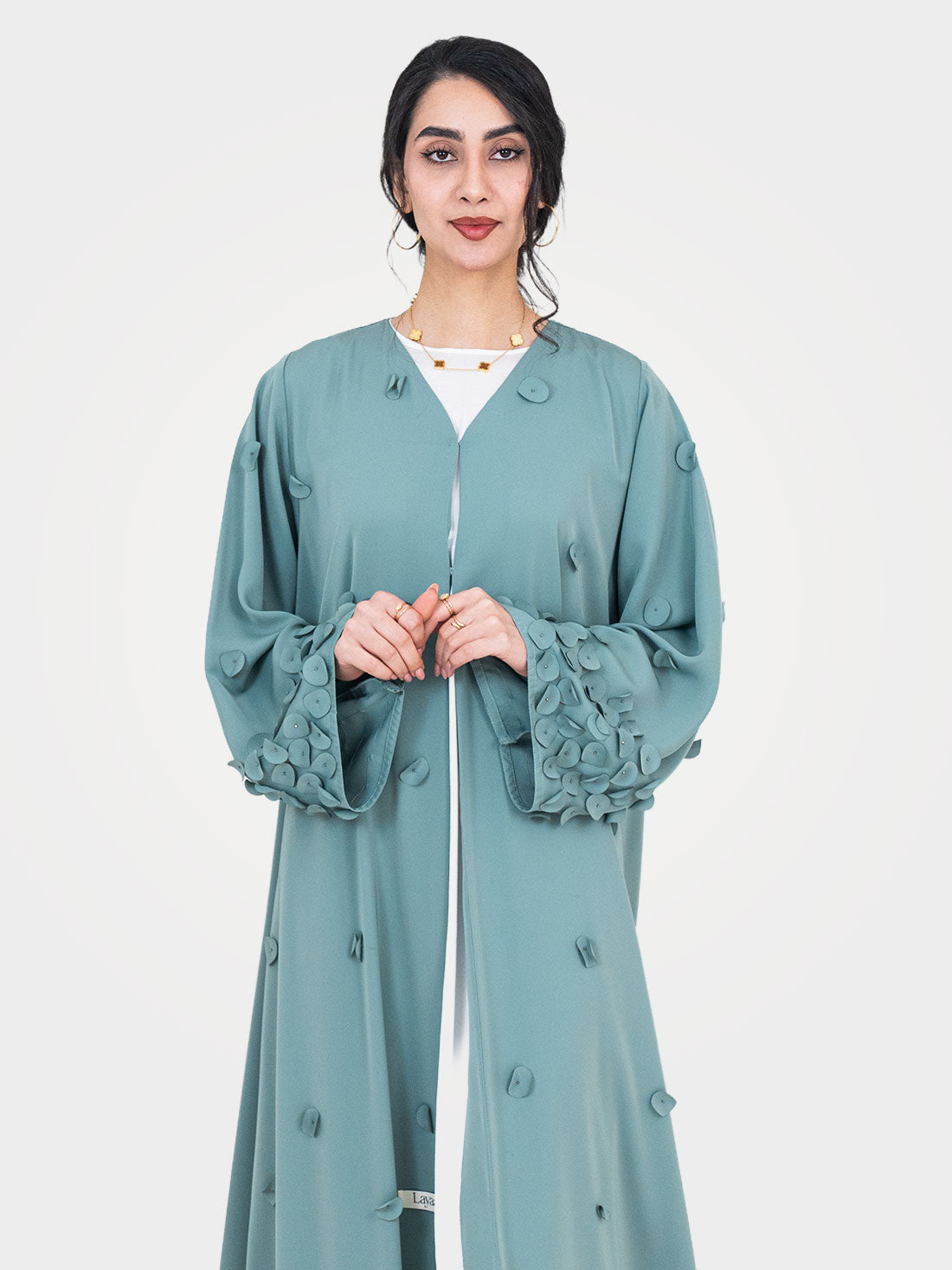 The Sage Petal Abaya by Layaal is a study in soft elegance and modern femininity....