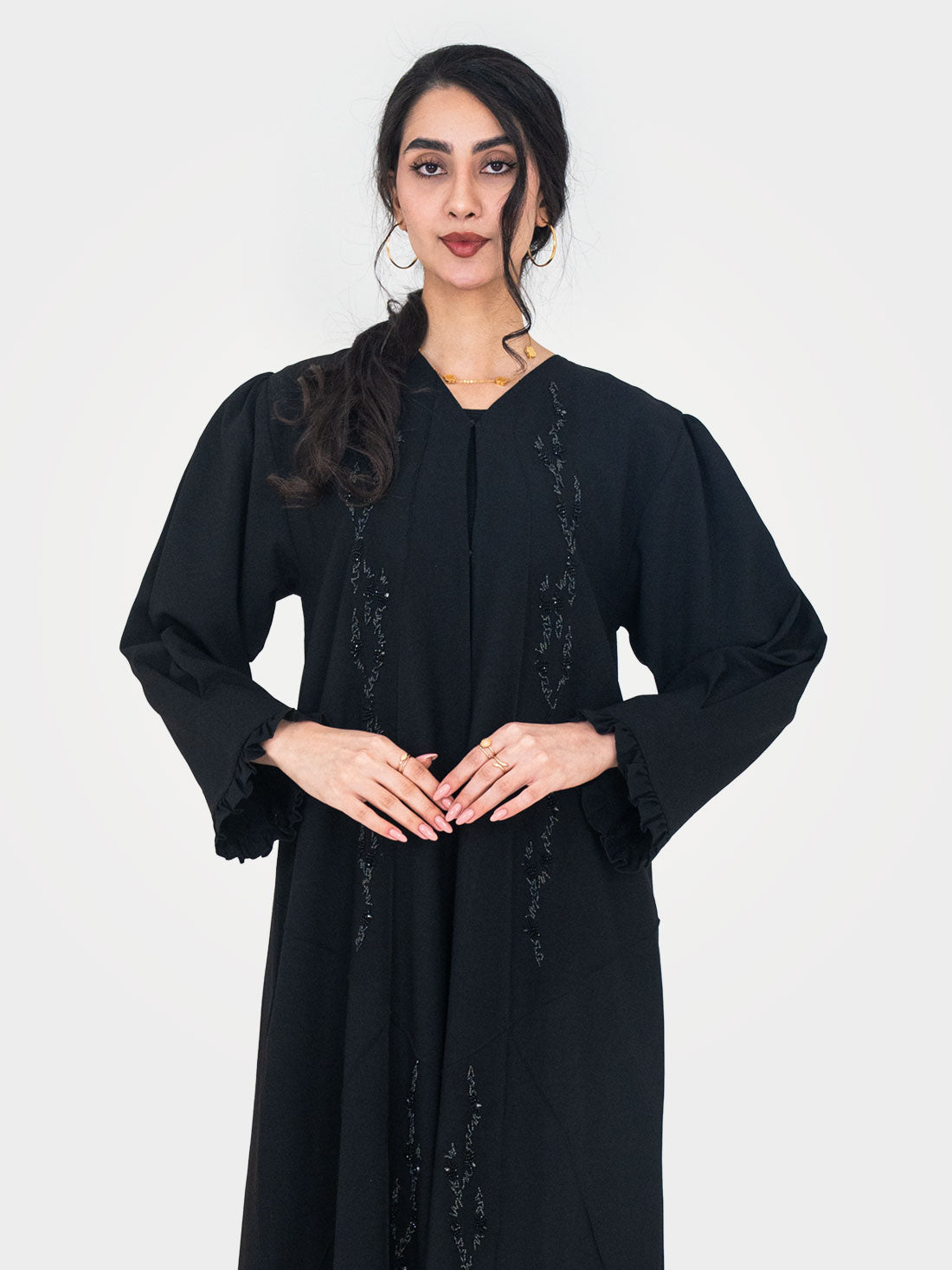 The Noir Ruffle Abaya by Layaal is dark romance and modern femininity in perfect balance...