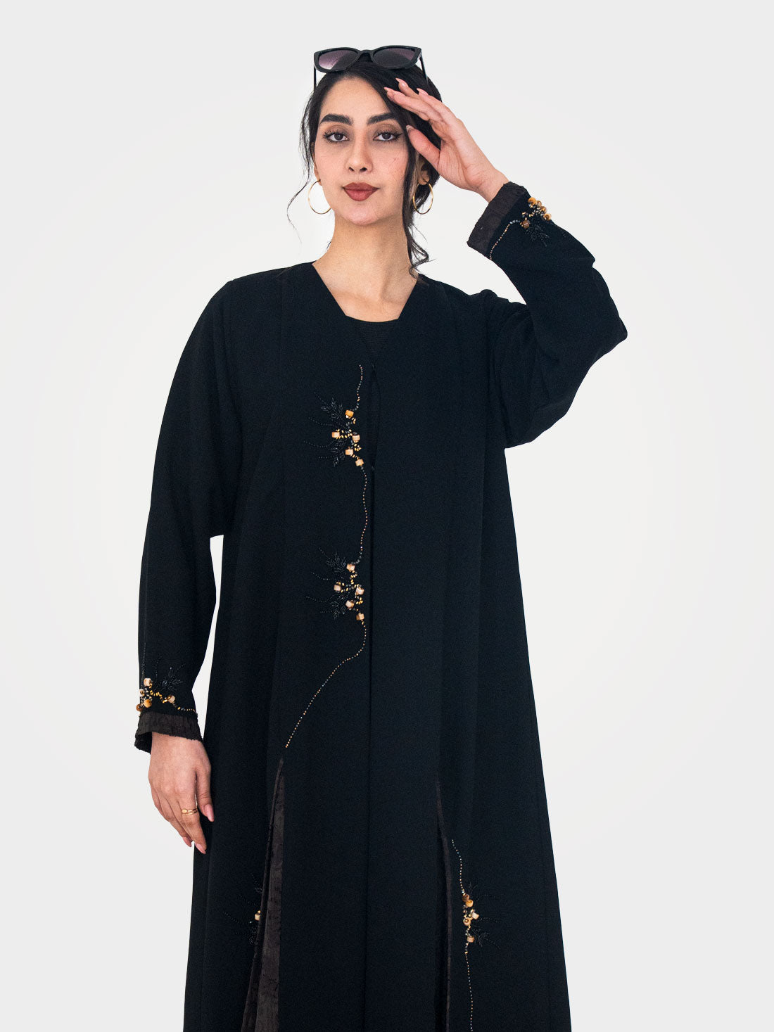 The Noir Amber Abaya by Layaal is refined elegance in its most artisan form —...